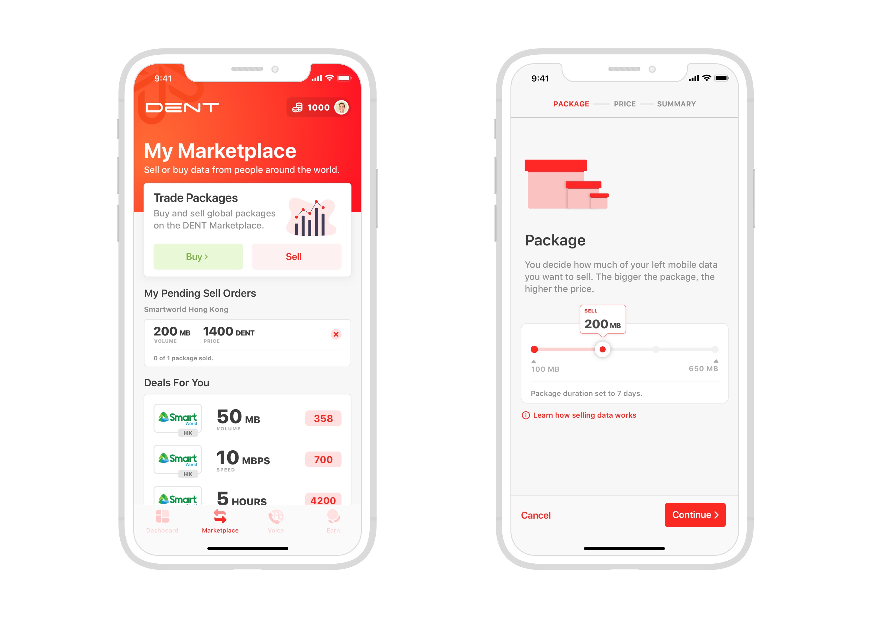 One of the integral features of the app is the ability to trade mobile data packages. In 2018, DENT started a pilot project together with Smart World Hong Kong, enabling users to buy or sell other users' data right from their mobile contract. In 2019, data trading was widened to the entire user base in a simplified, package-based version.