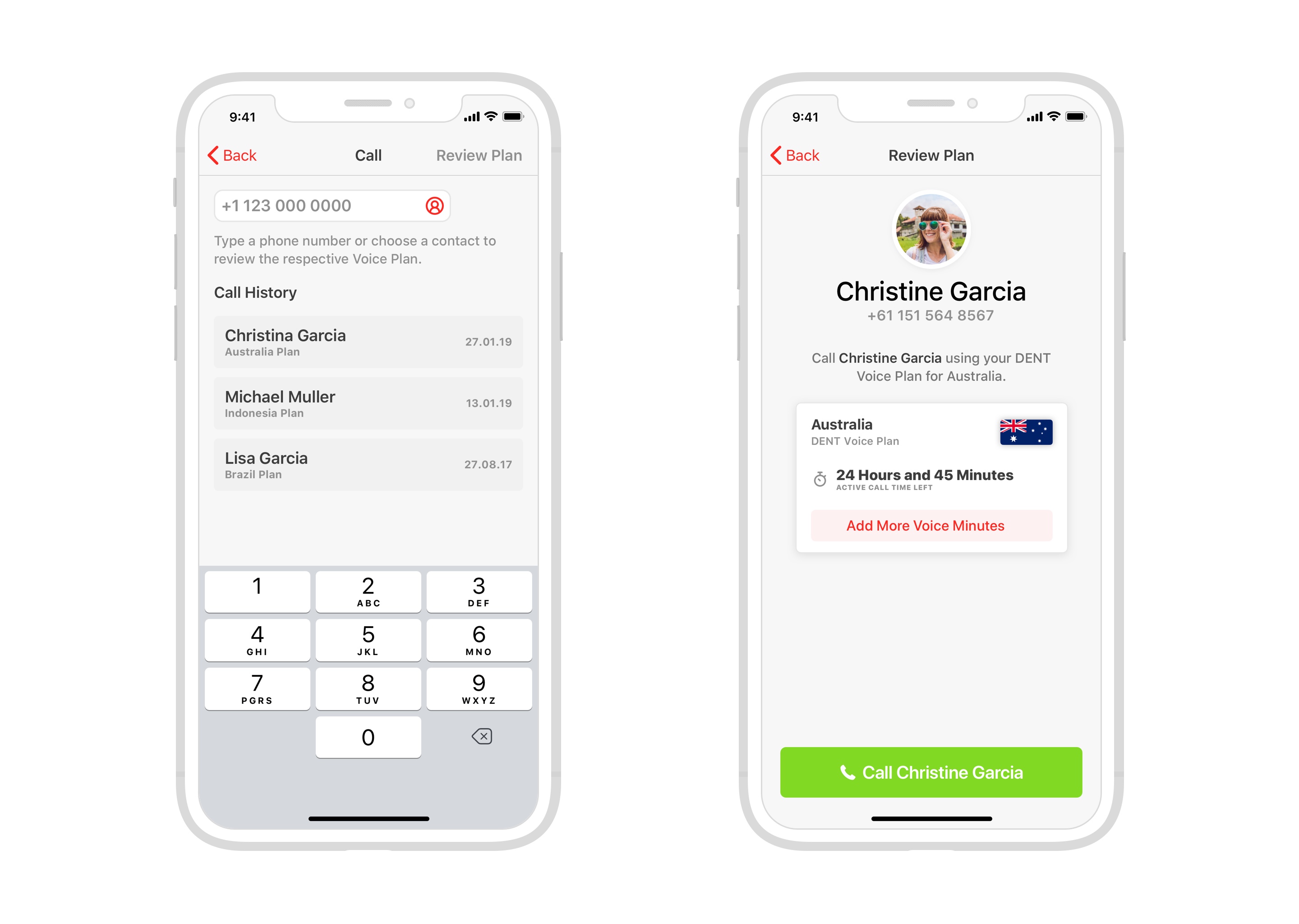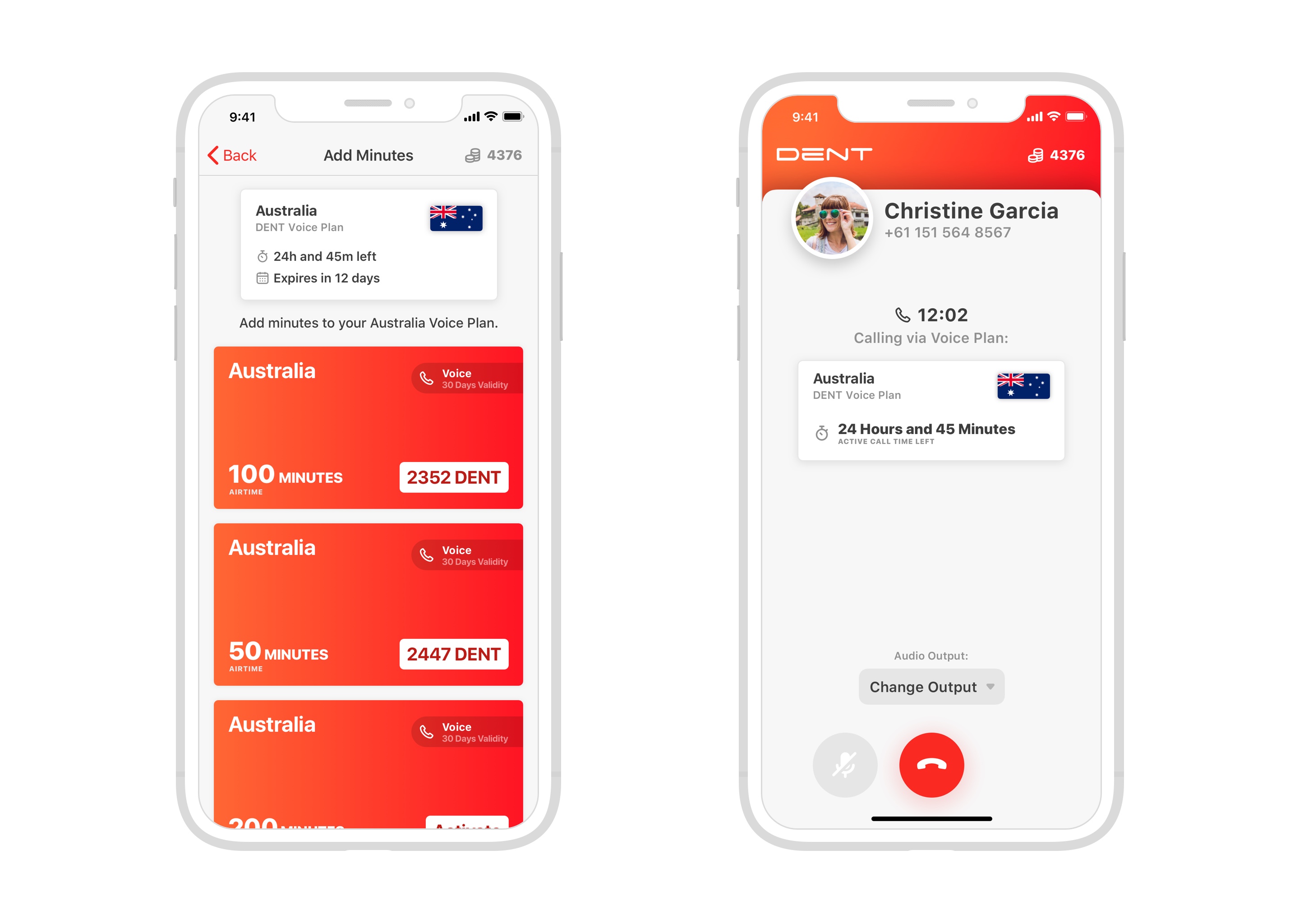 Using voice packages, users are able to call landline phones through the DENT App. The functionality was conceptualized for target groups in Africa and Asia where calling landline and phone numbers through a wifi connection is a practical case (comparable to Skype). Voice packages can be bought per-country and work as a prepaid plan.